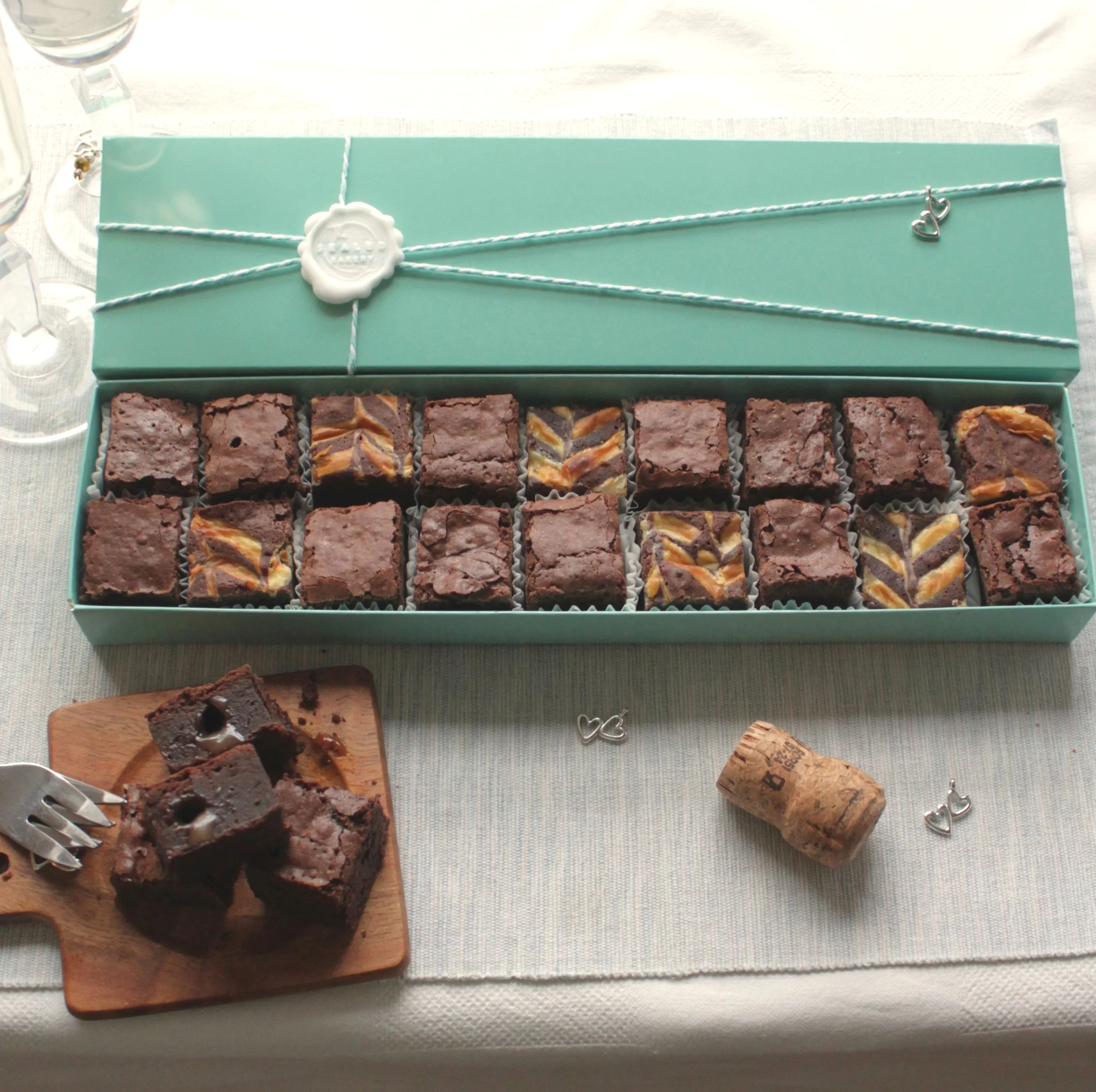 Each box is tied with a double heart charm symbolising connection, togetherness and love. A subtle and elegant finishing touch designed to be kept long after the brownies are gone – perfect for attaching to a bracelet or necklace or clipping to a keyring or handbag.